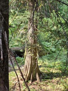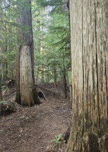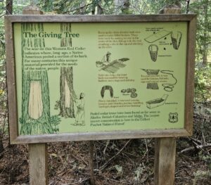 Before we started our foray, we visited these ancient cedar basket trees. You can tell they are old by the thickness of the scab along the edges of the scar and by the axe marks instead of the more modern saw used to make the horizontal cuts when the bark was harvested.