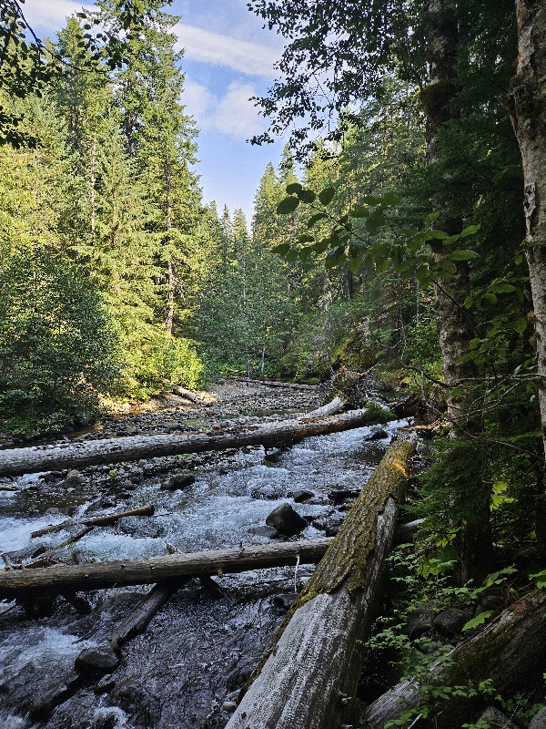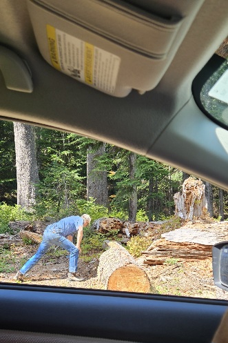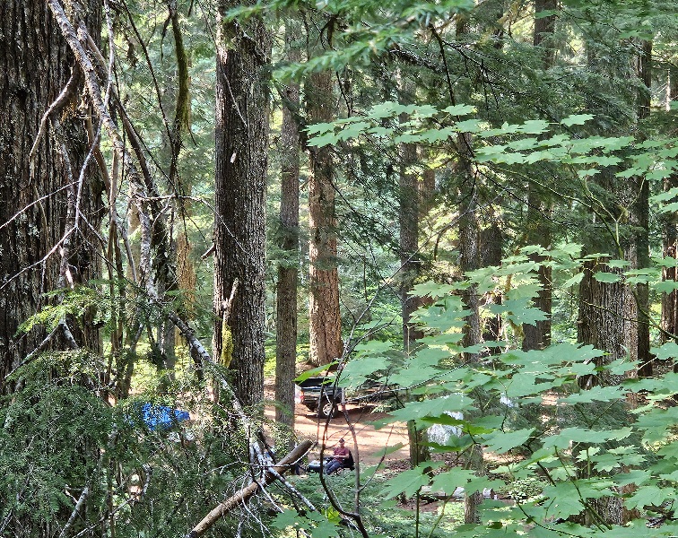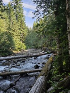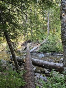 While Amy and Mike combed the hillside for chanterelles, I walked down to the river. I found my skepticism was justified – where the mapping app showed a bridge there was nothing but a tangle of logs hanging over white water. You could walk across the river but driving was not an option.