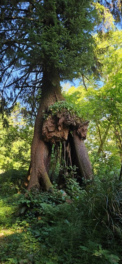 The trees were weirdly contorted – octopus trees start growing on old, decaying stumps, their roots stretching to the ground below. Eventually, the host stump rots away, leaving huge trees supported by a hollow web of gnarled and calloused roots.