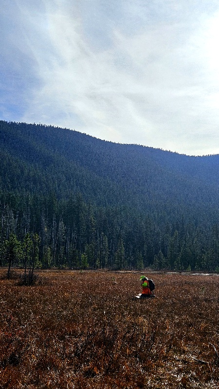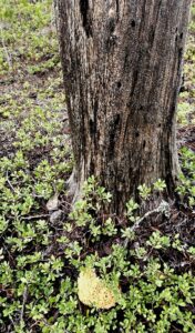 On our way down the hill, I spotted a flash of color at the base of a snag, out in the lava bed.