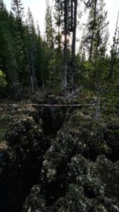 I scrambled through the brush and down the bank. A deep, rocky chasm blocked my path. Taking a circuitous route, I found myself behind the snag separated from my goal by a deep crack in the ground. I had to continue past, following the crack until I came to a crossing and could double back to the dead tree I had been stalking.