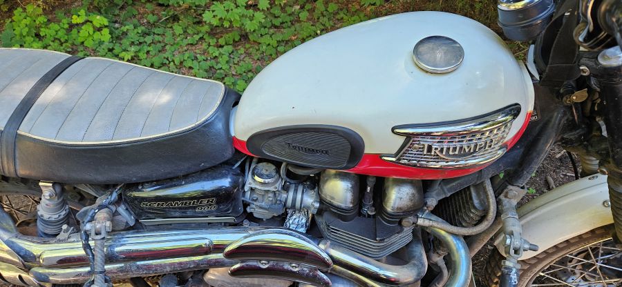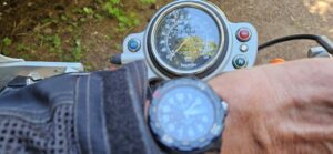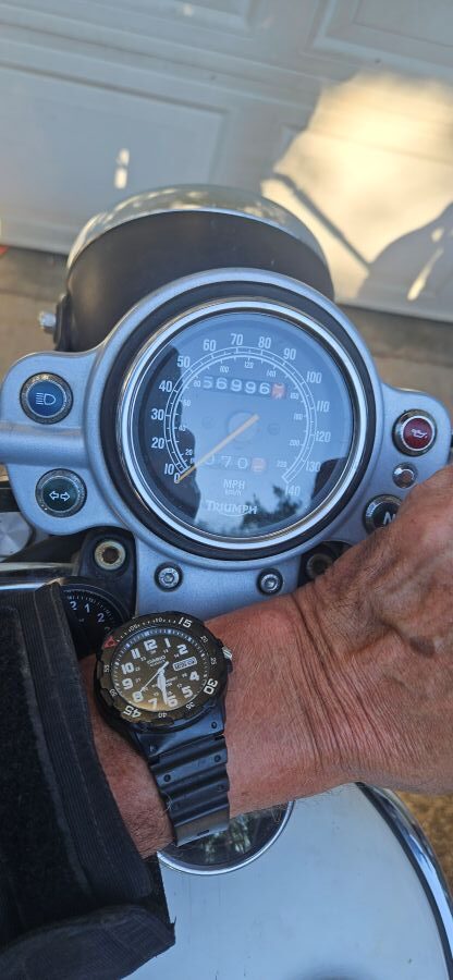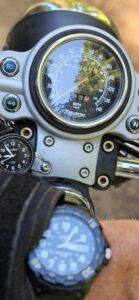 I rolled the Triumph out of the shop and we suited up – Walter in harness and doggles, me with helmet, boots, gloves and a mesh jacket over an evaporative cooling vest. We’d be OK if we kept moving.