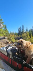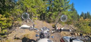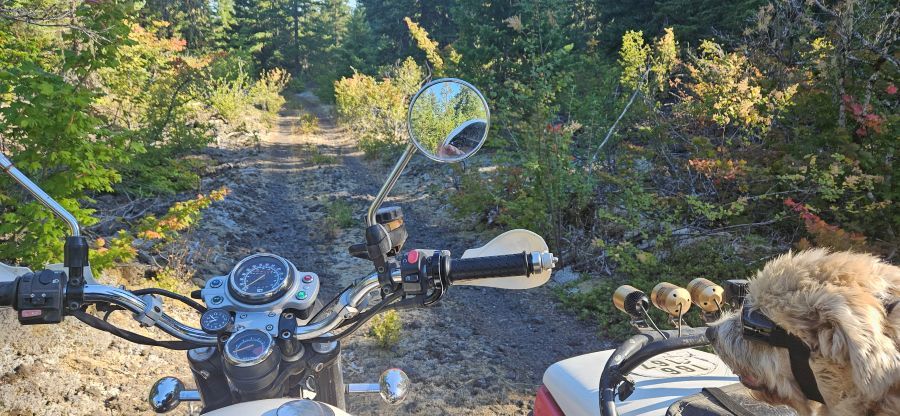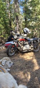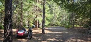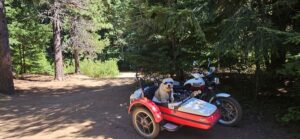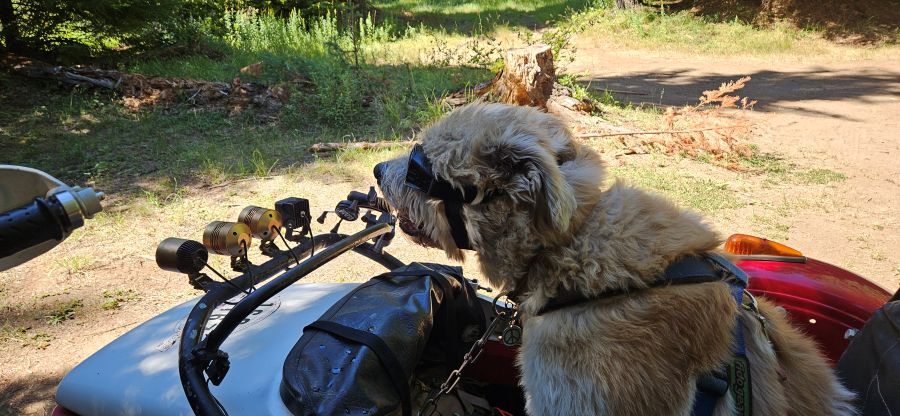 After about an hour of pleasant repose, we hopped on the bike and started home. At the bridge I imposed on the family camped there, who were kind enough to allow me access to the creek to soak my vest. They had a passel of dogs ranging in age from a few months to 13 years. The nicest pack of pups you could hope to come across, preoccupied with licking and playing and rolling in the dirt. They didn’t bother Walter, who remained aloof in the sidecar.