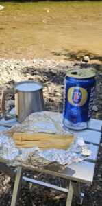 Walter and I dismounted and I set up a table and chair on the beach. While Walter splashed in the creek, I retrieved a beer from the sidecar and a foil wrapped tamale from the hot engine case.