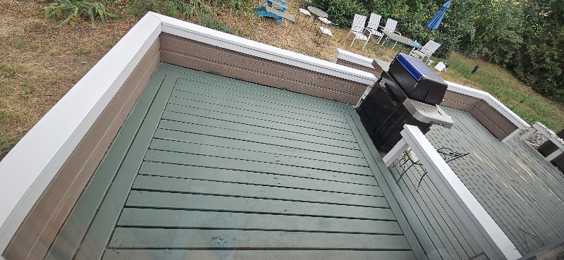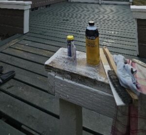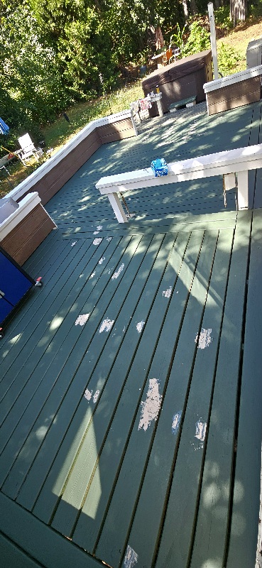 I painted the back decks yesterday, and soaked the soft spots with Minwax wood hardener. This morning I filled the holes with Minwax epoxy wood patch, which I sanded this afternoon after it had hardened in the sun. I touched them up with paint, then started rolling on another coat across the entire expanse. The rails have three coats. The small deck outside the slider has three coats, the main deck has two coats and the landing by the hot tub has one coat. I will need to do another coat by the tub and the rails and steps by the hot tub need some attention, but that will need to wait until I feel better.
