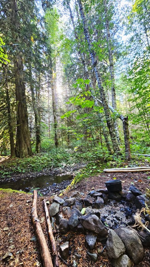 We found a remote stream side campsite. No garbage, an old fire ring and a cleared area right on the bank with almost enough room to set up the tipi. I had brought the 16′ tipi but set it up a little short to fit it in the space.