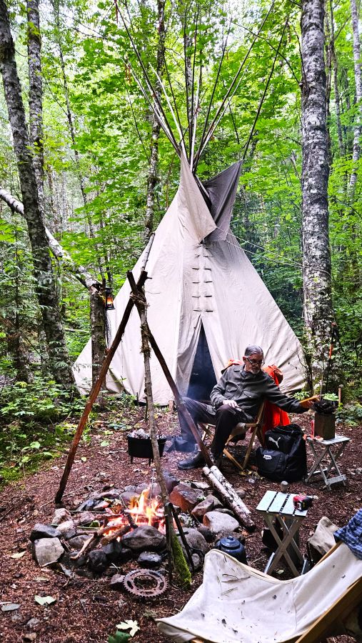Mike drove the truck down to where he could catch a cell signal and phoned Jason to let him know how to find us while I stayed in camp to set up the tipi. When he returned, we got a fire going and hung a Dutch oven over the flames to heat up some garlic bread. I brought a thermos of turkey soup.