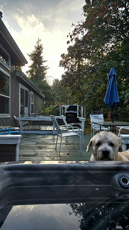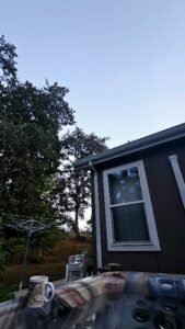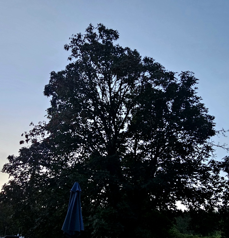 9/10/25 6:00 56 (13.3) Clear blue sky. Maple leaves shiver in a faint breeze. The moon, three days past full, is shining through the oaks.