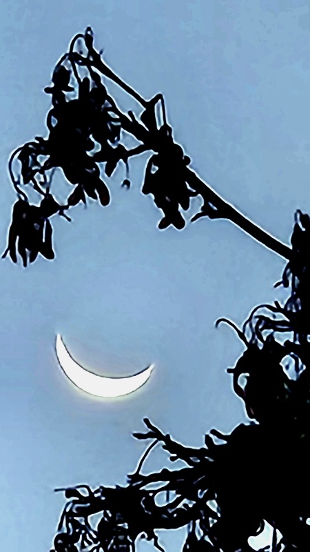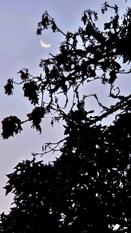 The waning moon pokes its horns through the maple leaves.
