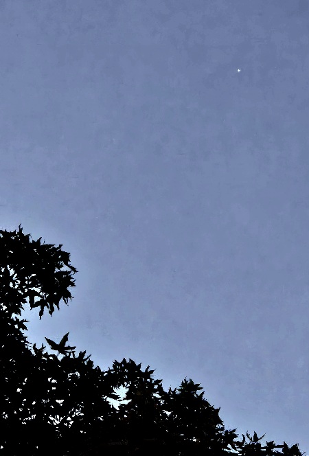 The morning star floats above the trees, shining brightly against the darkly muted dawn.