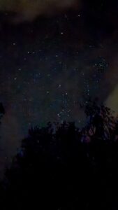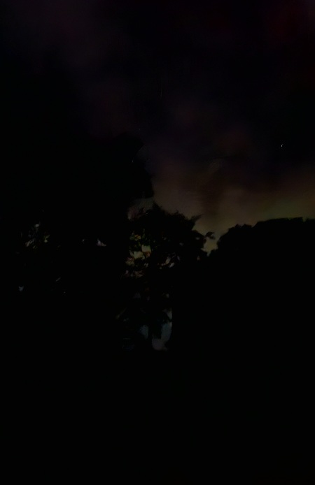 I can see stars through the clouds. There is no wind. Crickets are thrumming. An occasional acorn drops from a tree. The gibbous moon has set. My tea is hot.