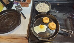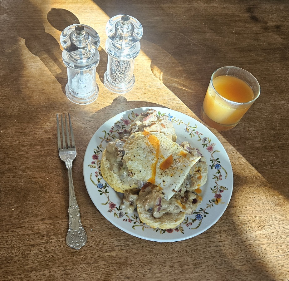 Biscuits and sausage/chanterelle gravy topped with an egg over easy and chupacabra sauce, washed down with unfiltered apple cider.