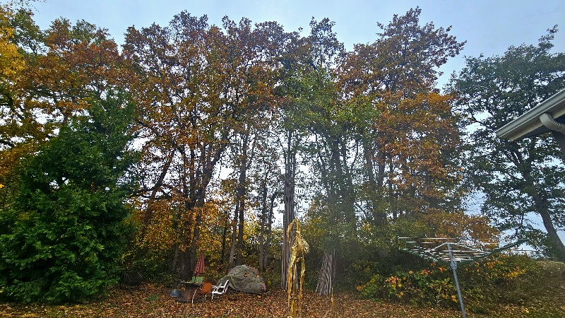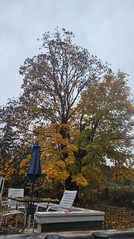 Raining. The remaining leaves on the trees are yellow.  Almost as many carpet the ground.