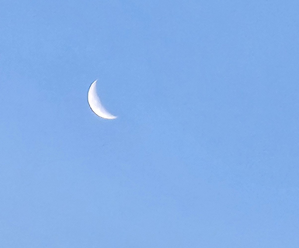 A crow calls. The moon is a discarded fingernail clipping, white against a patch of blue.