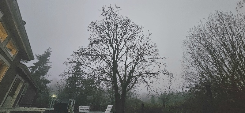 Overcast with heavy dew. Fog is eddying into the canyon, flowing through the trees from all directions.