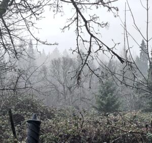 For a moment, the stillness is disrupted by the rapid tattoo of wings beating the air and birds muttering to each other. Then they are gone, swallowed by the fog.