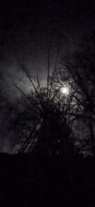 The moon, three quarters and waning, is resting atop the oaks. Stars are shining in a rich, blue sky.