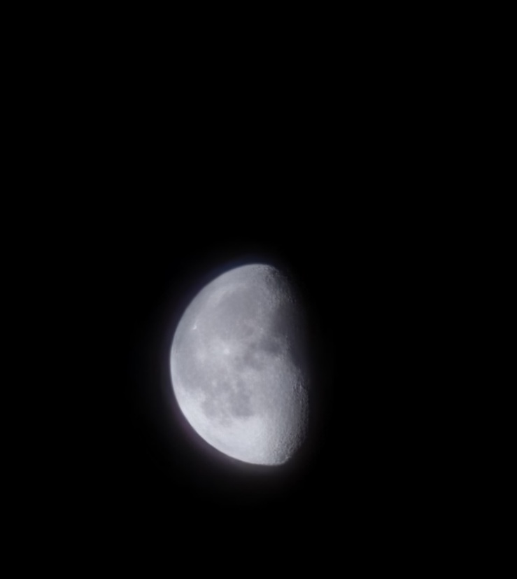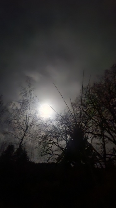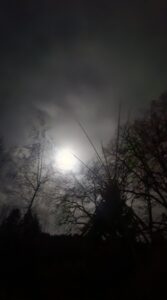 The moon, waning gibbous, and at least one star pierce the thin clouds overhead.