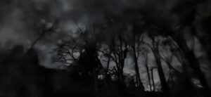 The moon, waning last quarter, hangs S SE, in a strand of clouds.