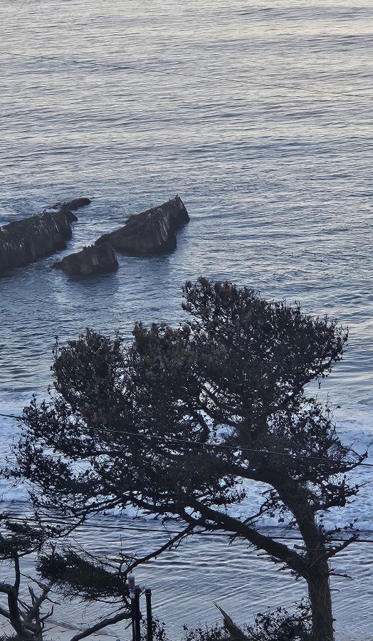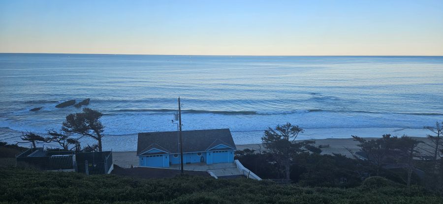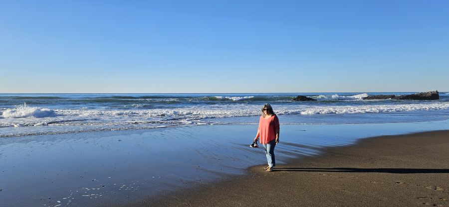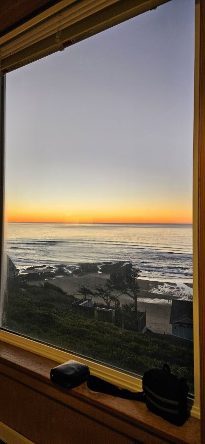 I got up about an hour ago. It was still dark and 37F (2.7C). Amy’s sleeping so Walter and I took a short walk on the beach.