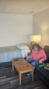 Amy’s sisters and Linda Floyd each have rooms in the newer units which were not built to the same standard as the original and have surpassed its dilapidation. Their windows are dirty and fogged spoiling the view. The shower handle came off in Lynne’s hand, rendering it useless.