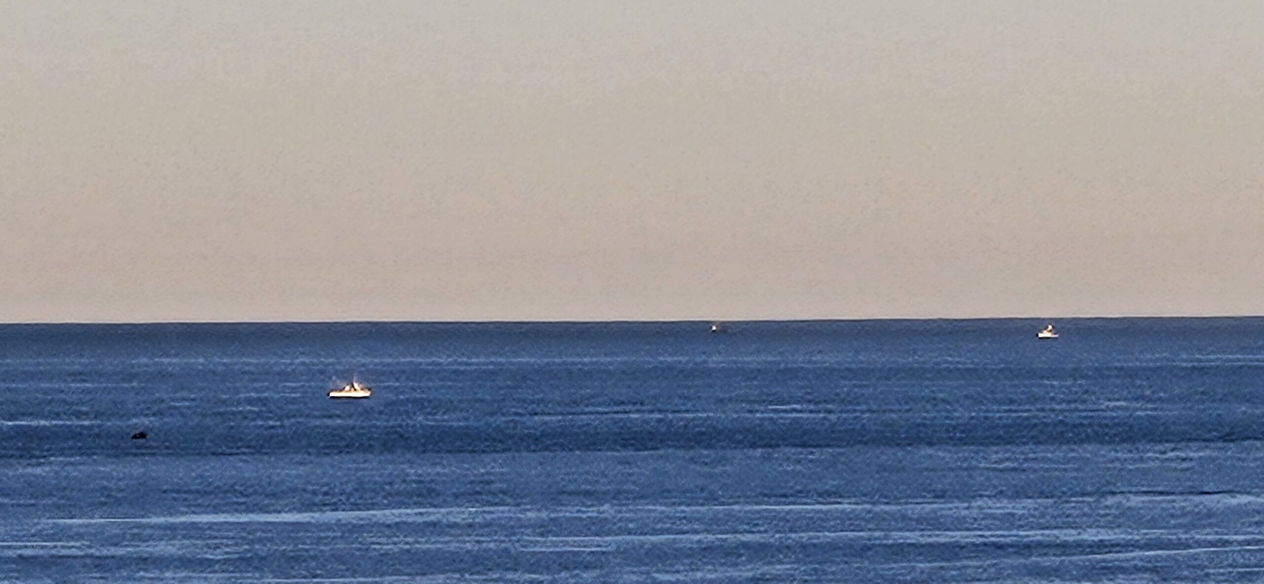 Fishing boats dot the horizon, deck lights glowing through the morning sea haze.