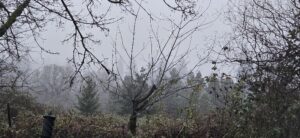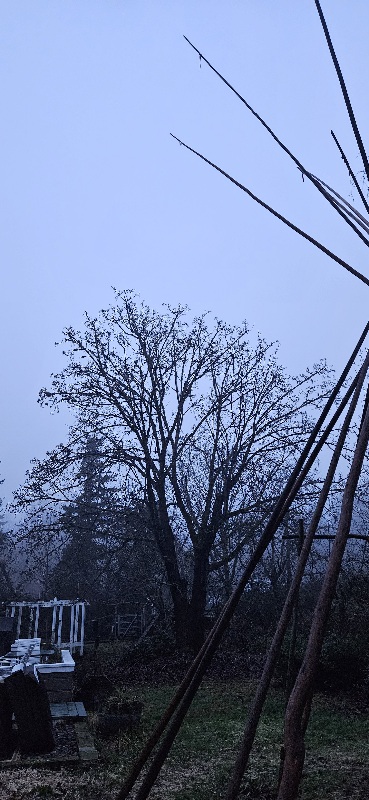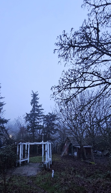 Wood smoke hung on the ground, clinging to the trees and pooling in the low spots and swales in the orchards, mixing with the light fog.