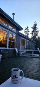 A delicate lace of thin white clouds decorates the blue sky overhead. The fragile wisps begin to tinge pink as sunrise approaches.