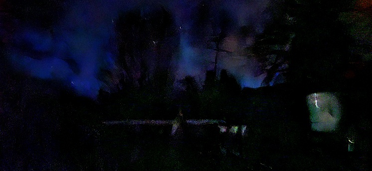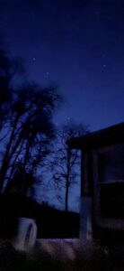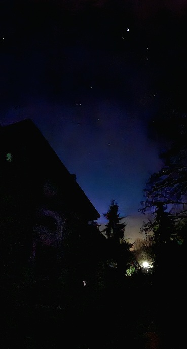 3/21/26 5:30 48F (8.8C) Faint breeze with stronger gusts. Clear and starry above, surrounded by a ring of low clouds