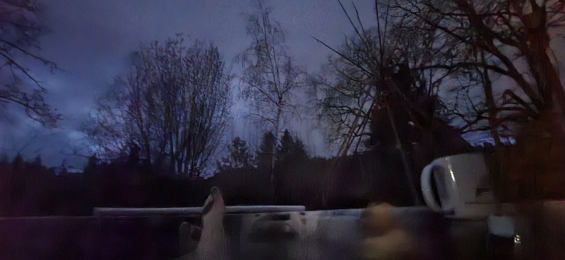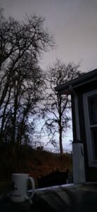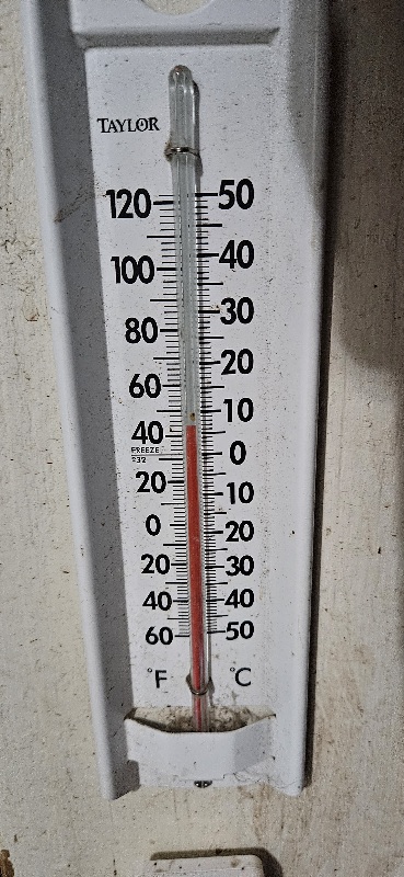 3/25/26 6:00 44F (6.66C) Calm, quiet, mostly cloudy with a ring of clear sky around the bottom.