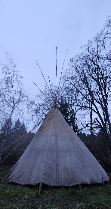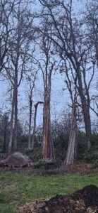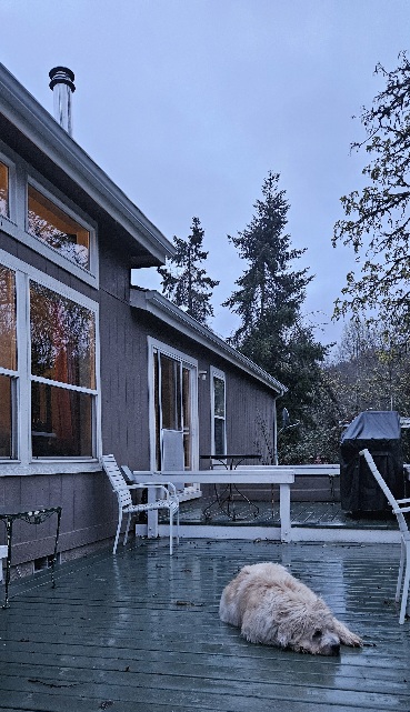 4/1/26 6:30 40F (4.4C) Gray and damp. The moon is full behind the clouds. It’s been raining;  everything is wet. There is no wind.