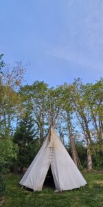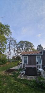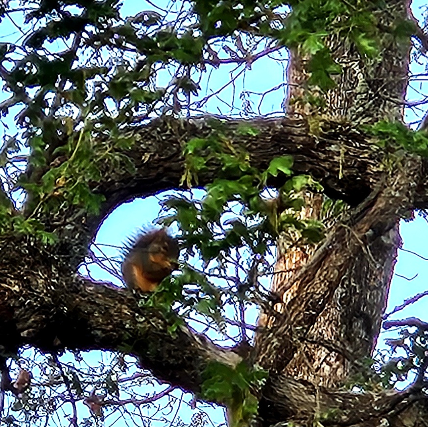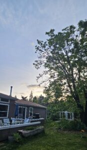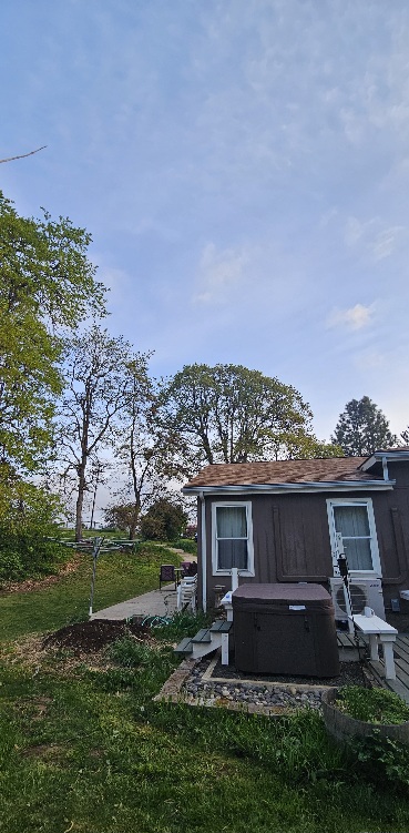 4/23/26 6:45 42F (5.5C)  A hint of a breeze stirs the leaves beneath a blue sky delicately laced with clouds.