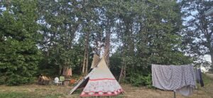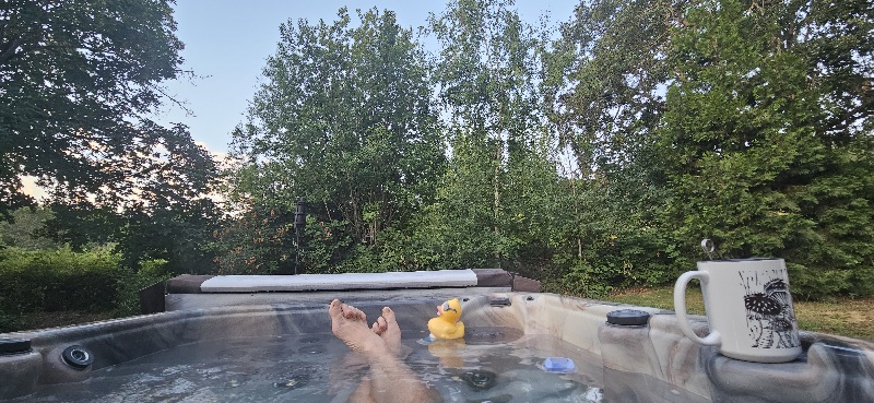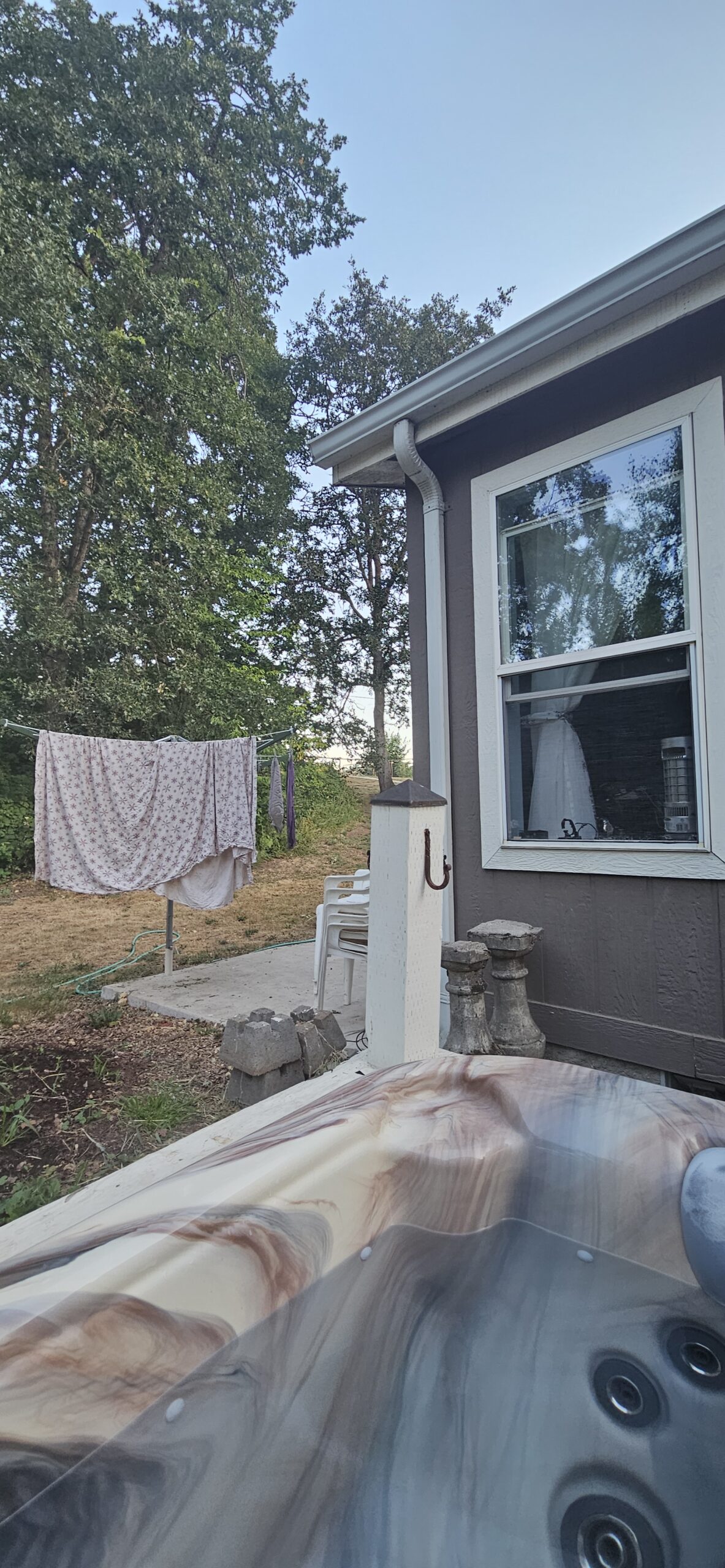 7/9/25 5:30 62f (16.6c) No wind. Blue sky with a few small clouds in the east, backlit by the still as yet invisible sun.