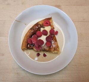 Breakfast of leftover cornbread in warm milk, topped with raspberries, molasses and melted butter.