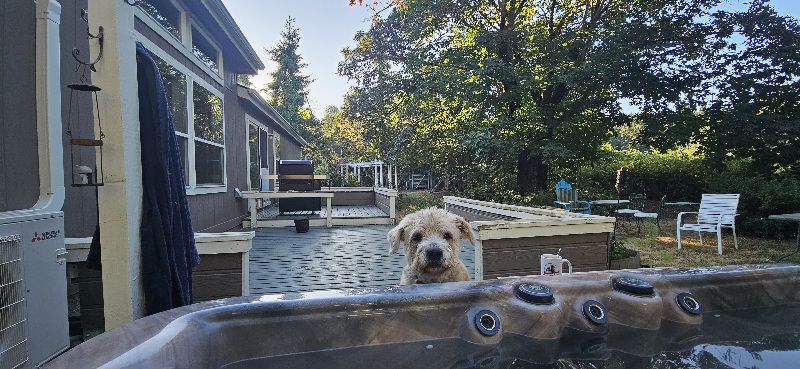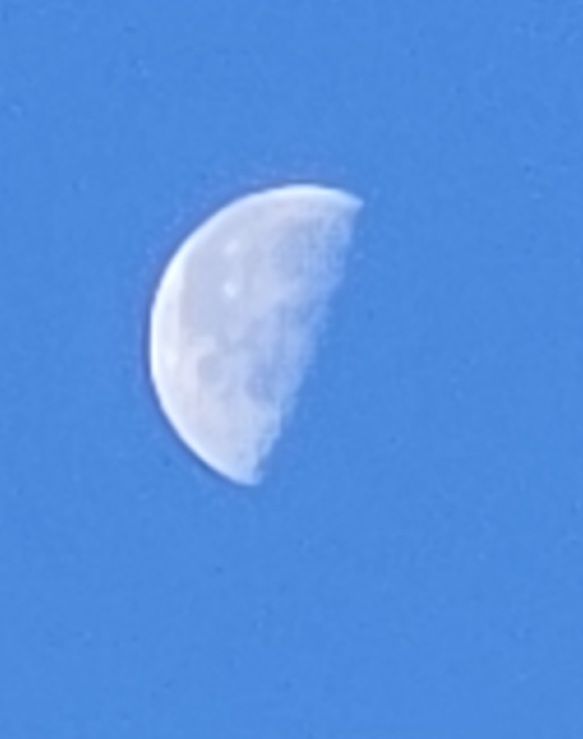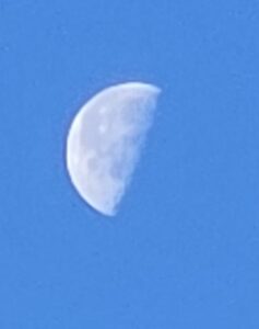 7/17/25 6:00 59f (15c) Waning, the half moon hangs in the south, straight up the canyon, brilliant white in a serene, blue sky. Birds chatter, the dog barks, while civilization hums quietly in the background.