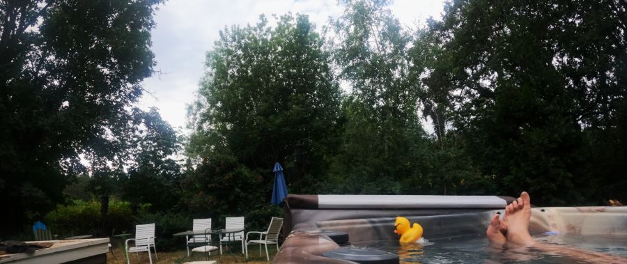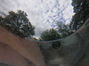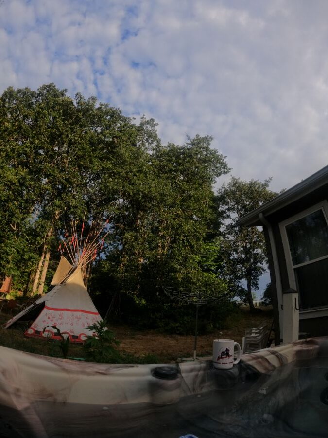 7/20/25 6:30 60f No wind . Fluffy, broken clouds overhead, a wall of dark grey to the west. 20% chance of rain forecast. Perhaps I should take the tipi down now so I don’t have to pack wet canvas later….