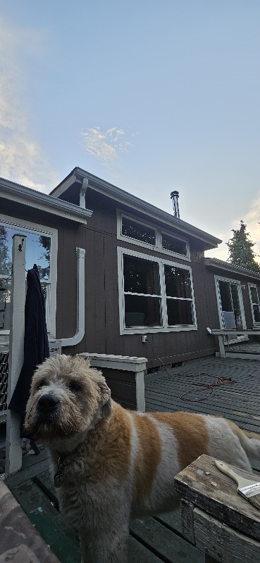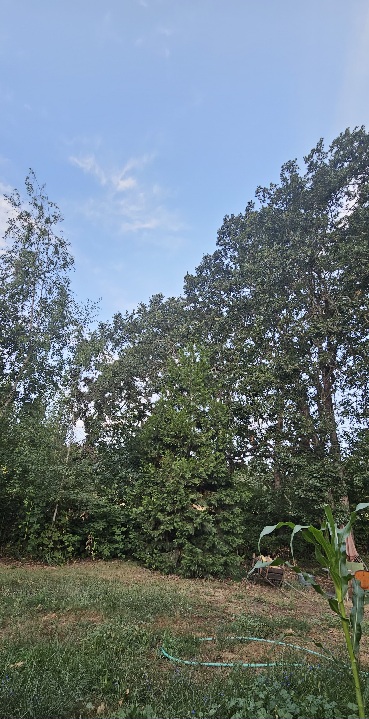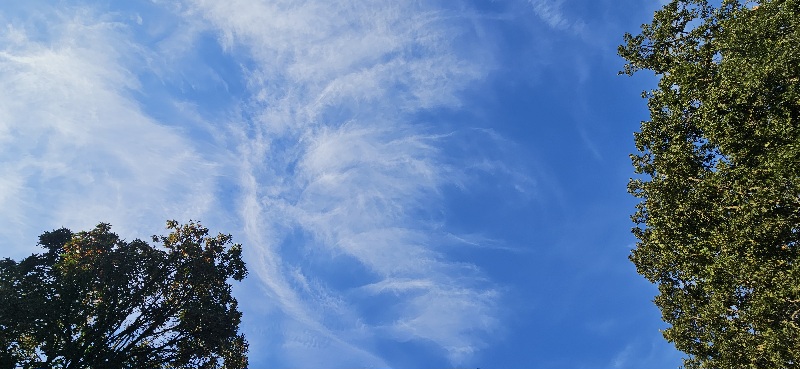 8/3/25 5:45 57f (13.9c) Clear blue sky with tendrils and random wisps of clouds, shining white from the still hidden sun.