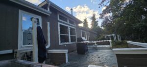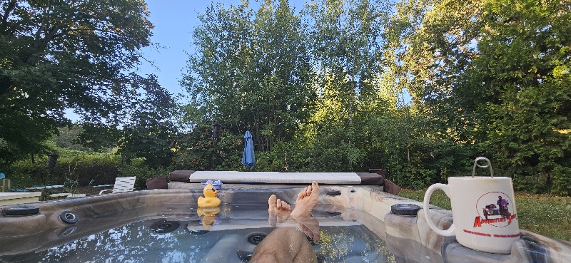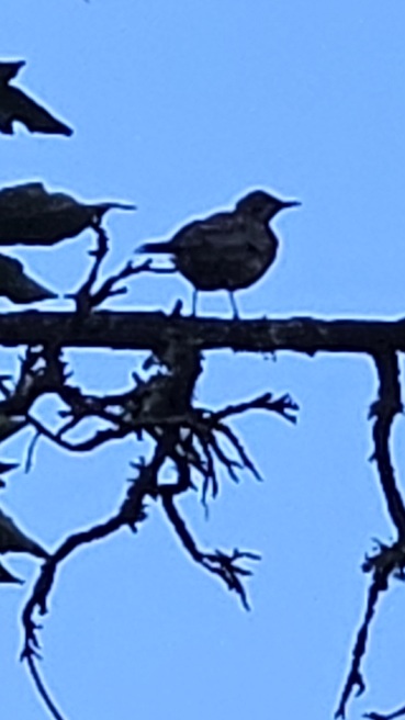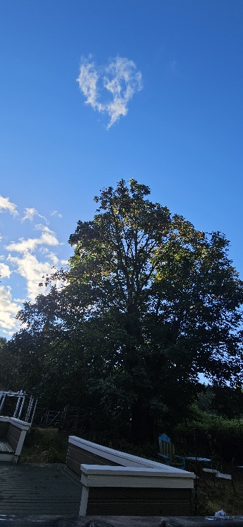 8/7/25 6:15 59f (15c) No wind on the ground but there is a fast westerly overhead. It looks like it rained  more last night. There is enough blue sky to offer promise, with enough clouds to hold some threat in reserve. The sun popped over the ridge at 7:00. Burma Shave.