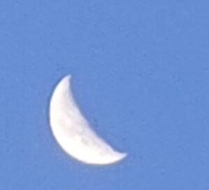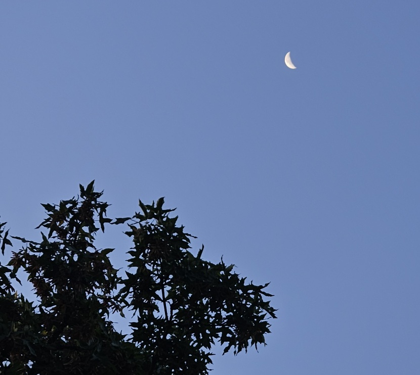 A squadron of jay’s screeching in low, land in the big maple, beneath the waning crescent moon. The rooster provides air traffic control, assigning proper approaches with loud authority.