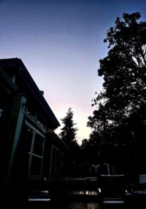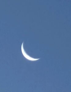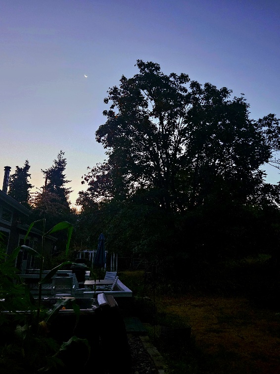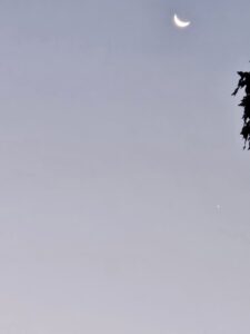 The fingernail moon hangs like a hook in the west, suspending two gleaming bright planets beneath it.
