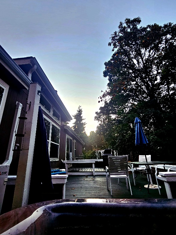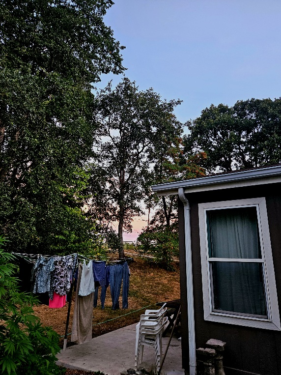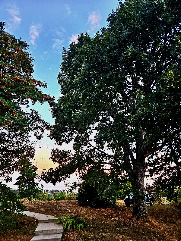 8/20/25 6:00 56f (13.3c) Calm, with blue sky surrounded by pink clouds. Birds twitter and chat in the trees, the rooster begins his daily complaint.