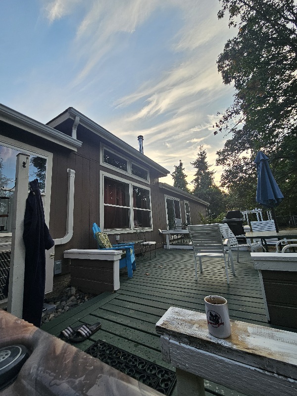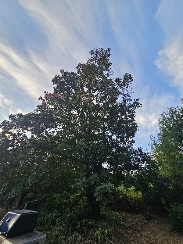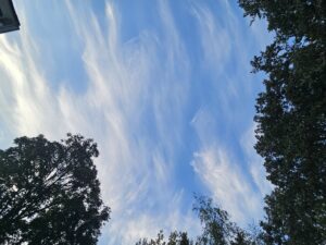 8/23/25 7:00 59f (15c) Sky filled with mares tails, calm, warm morning.