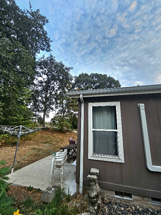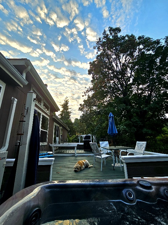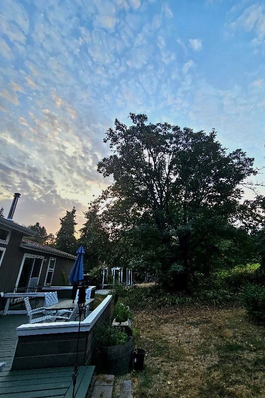 8/26/25 6:00 65f (18.3c) Still air with broken pink and white clouds against a blue background. Another hot day is forecast.