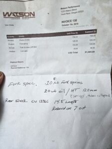 The OEM front suspension on the Triumph Scrambler is too weak for even mild of road work. Both springs and damping are too soft; the forks would clunk to full extension over bumps and bottom on landing. Watson Performance reworked my suspension with 10kg springs and 20wt oil up front. The measured height of the oil was 120mm without the springs and the forks collapsed.  This cured the fork problems with making the ride too harsh. Handling was much improved.