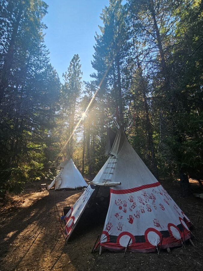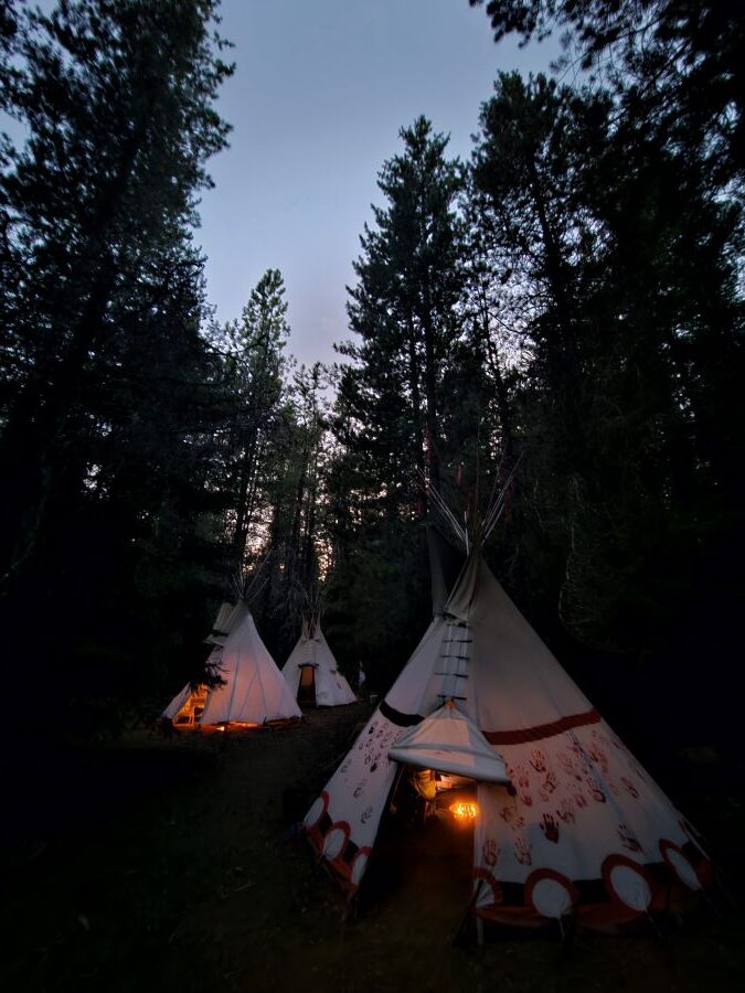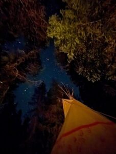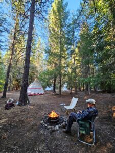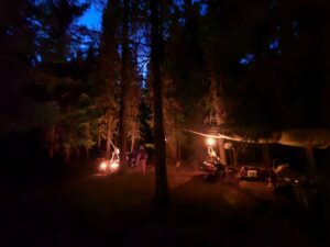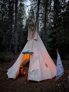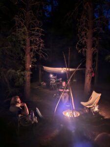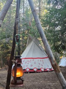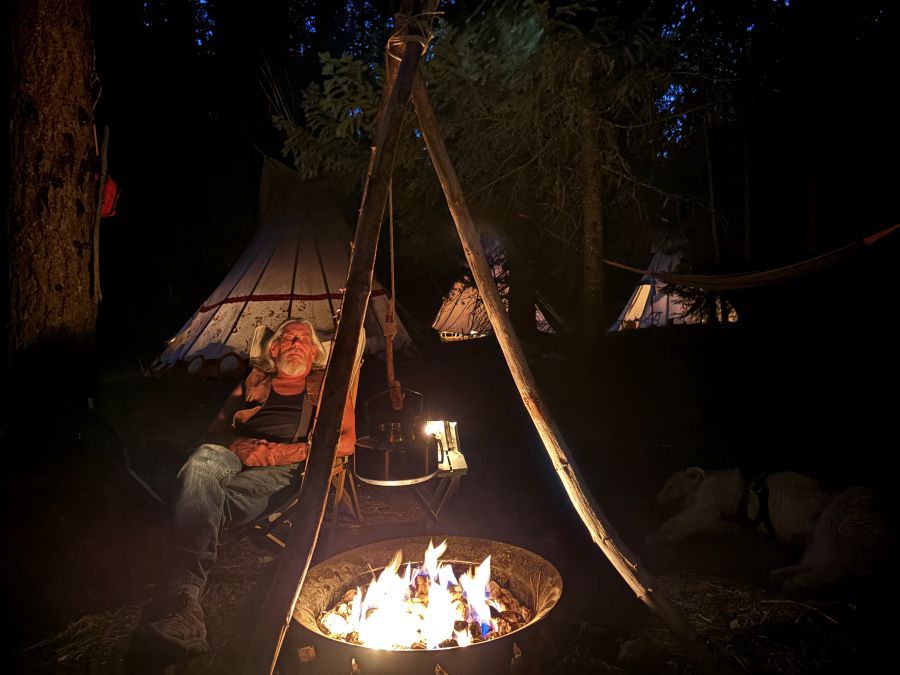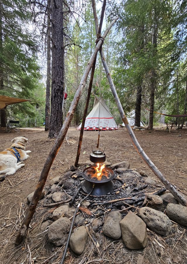 Because it was so dry, wood fires were prohibited. All our cooking was done on a gas stove. We had a propane campfire as well, and propane fire pits for each of the tipis. We missed the smell of woodsmoke, but still enjoyed the comforting glow against the dark backdrop of looming trees, staring mesmerized at the flicker of flames late into the night.