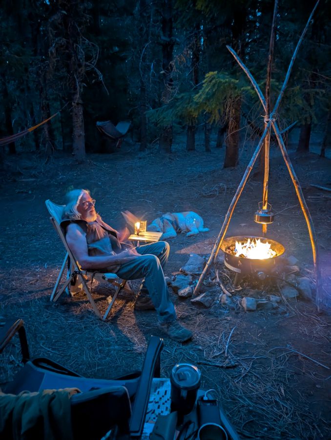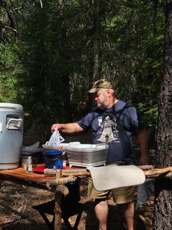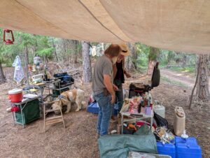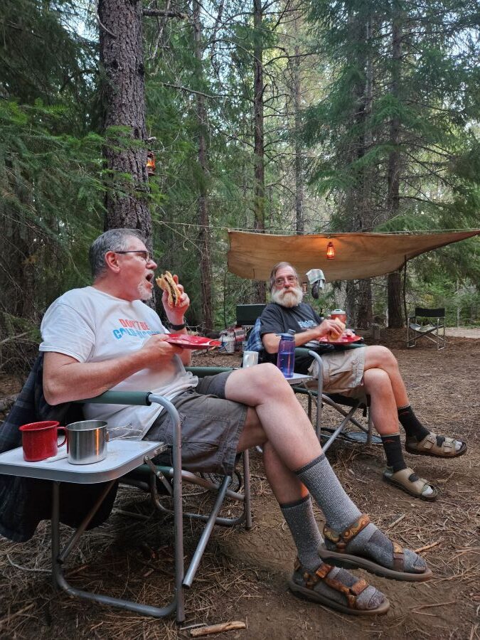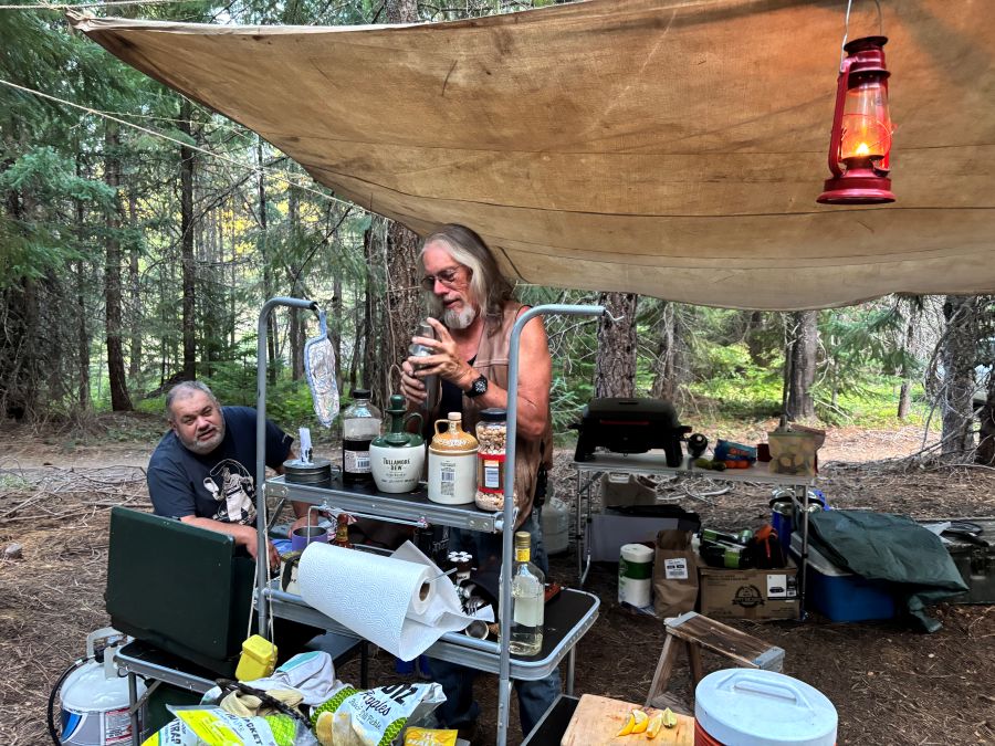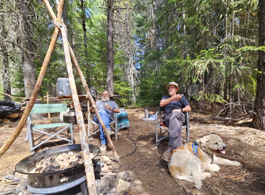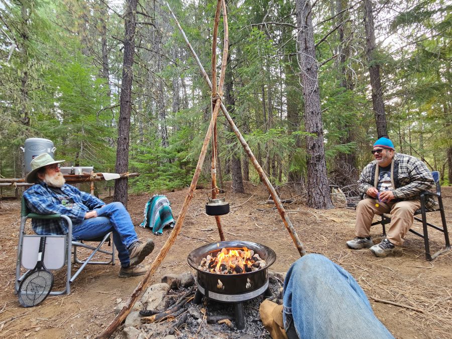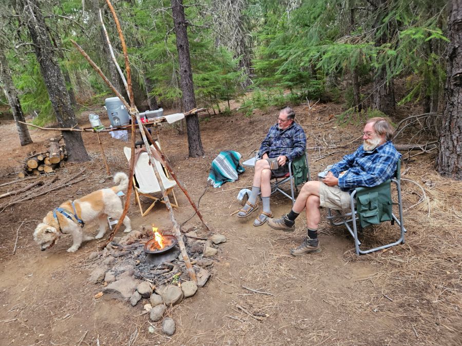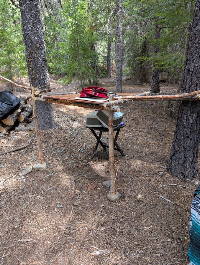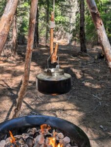 Andy spent the afternoon being bushcrafty, in between writing a sermon for Sunday and napping in the sun. Selecting three long straight sticks from the fallen branches littering the surrounding forest, he built a tripod to hang the teapot over the fire pit. Then he squared away the kitchen, lashing together a table, making a handwashing station, and stringing a tarp to shade the cooking area.