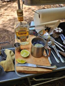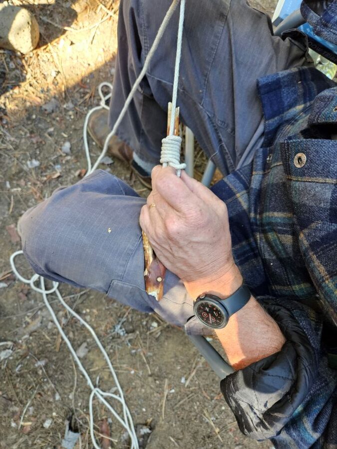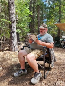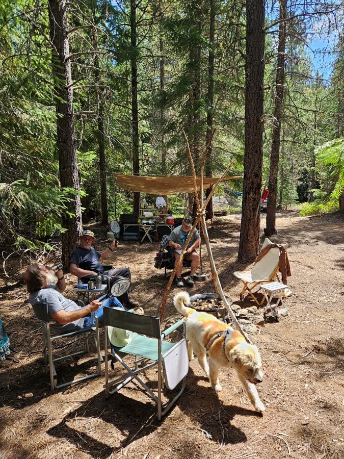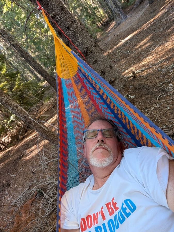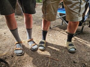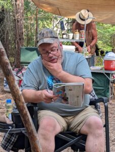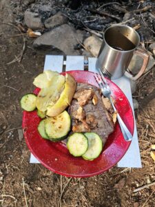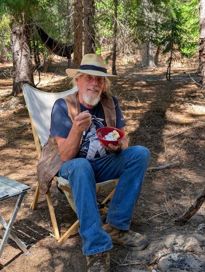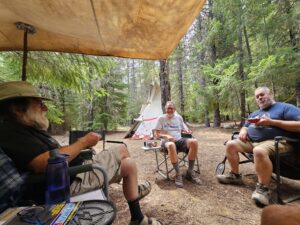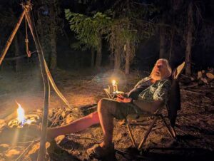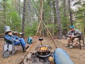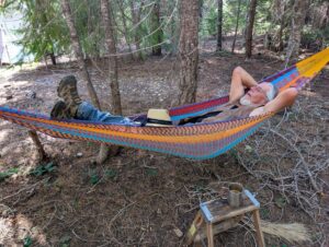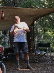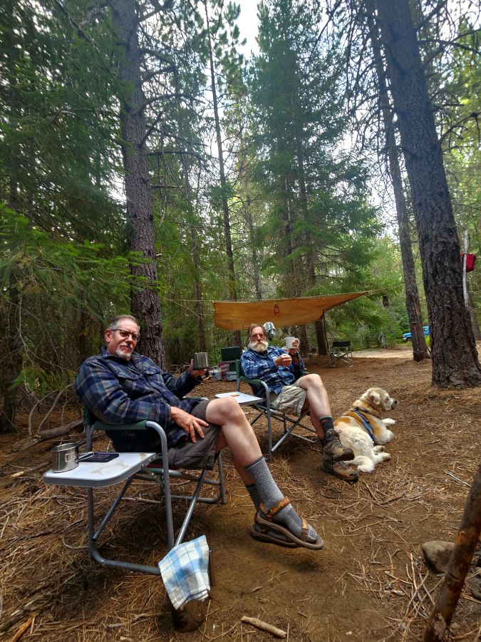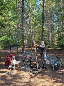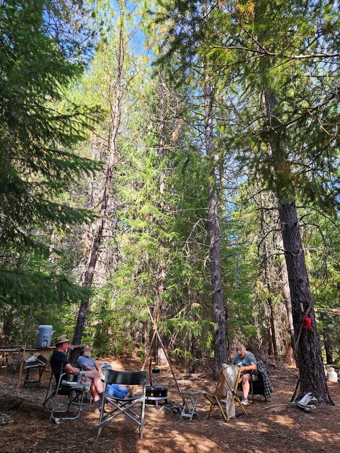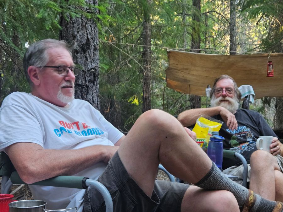 Andy spent the afternoon being bushcrafty, in between writing a sermon for Sunday and napping in the sun. Selecting three long straight sticks from the fallen branches littering the surrounding forest, he built a tripod to hang the teapot over the fire pit. Then he squared away the kitchen, lashing together a table, making a handwashing station, and stringing a tarp to shade the cooking area.