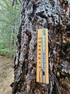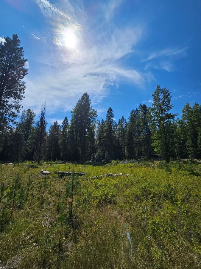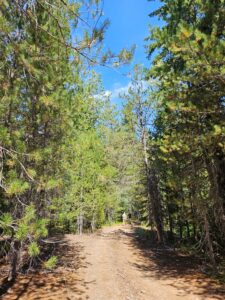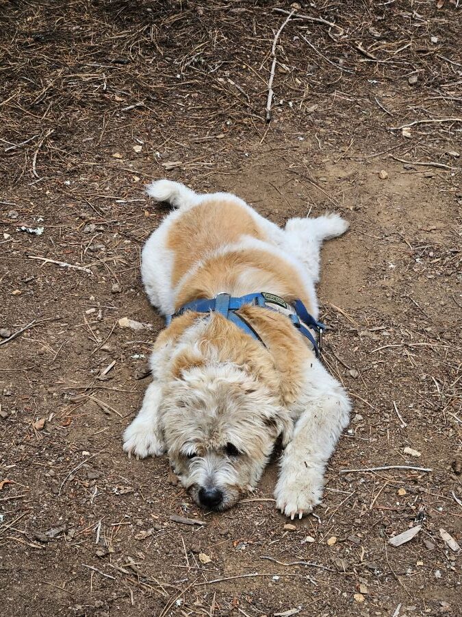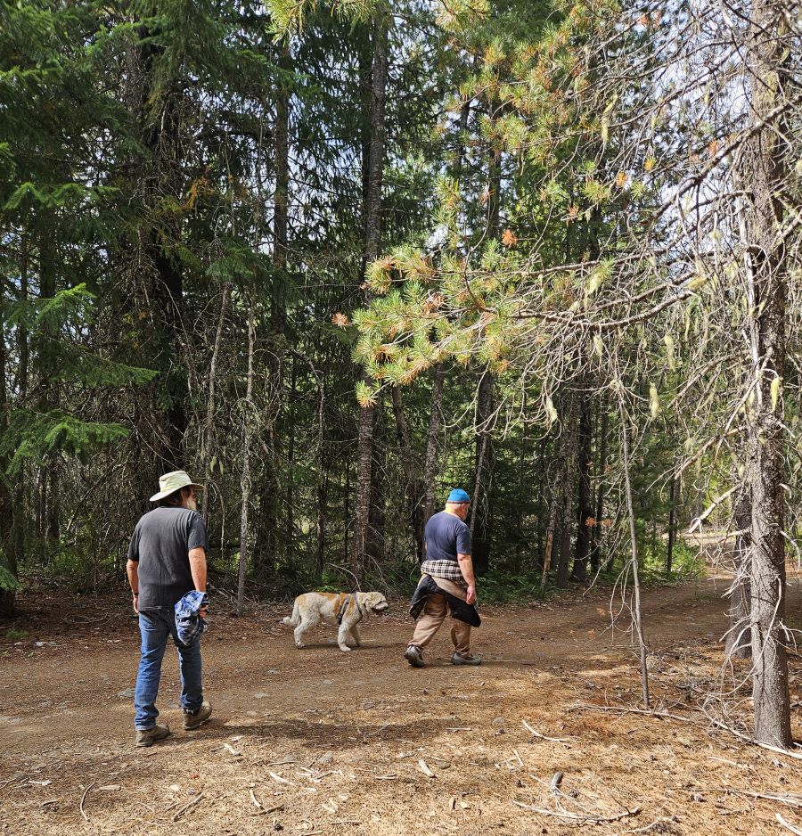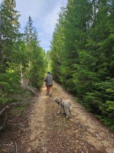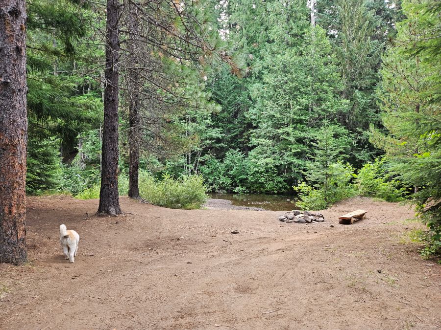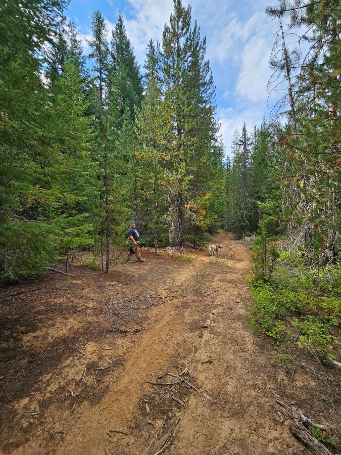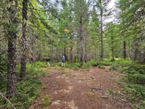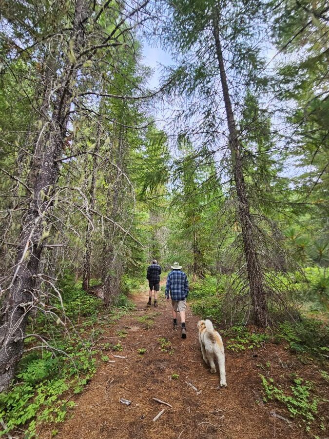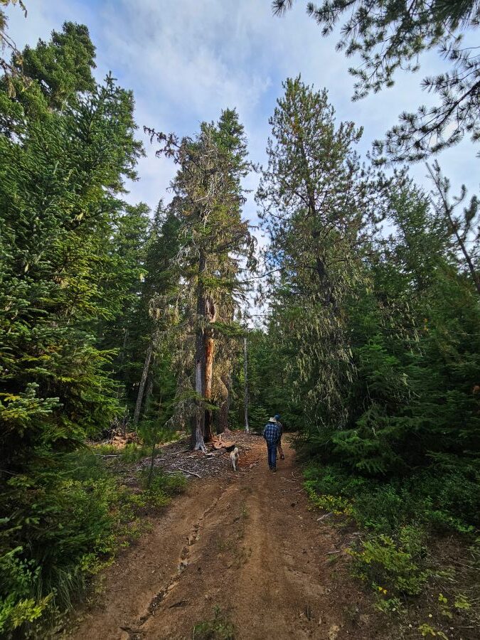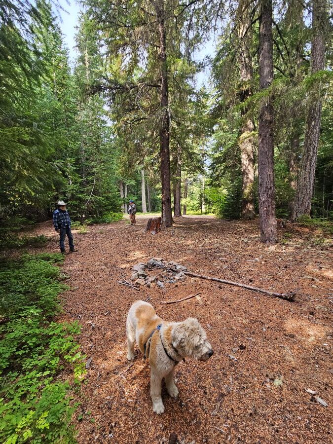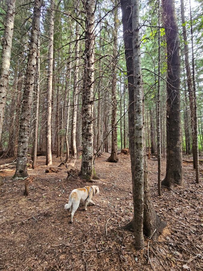 After exploring for about an hour we decided to return to camp. We bushwhacked straight down the hill in search of a second road which, if we succeeded in finding it, would put us near camp. We spread out, looking for an open path between the brush and downed trees. Walter ranged between us, his white fur bright as he wove between the dark pines and bobbed over fallen logs, bushy tail curled over his back and waving like a flag.