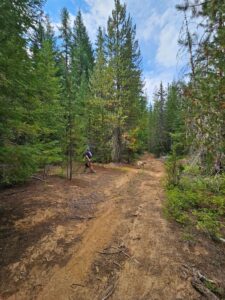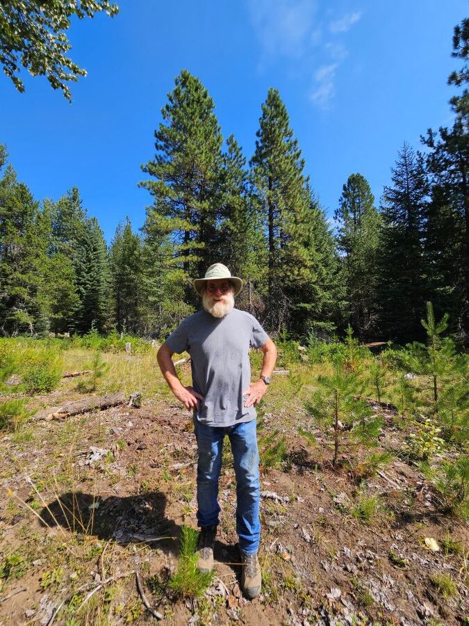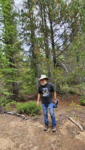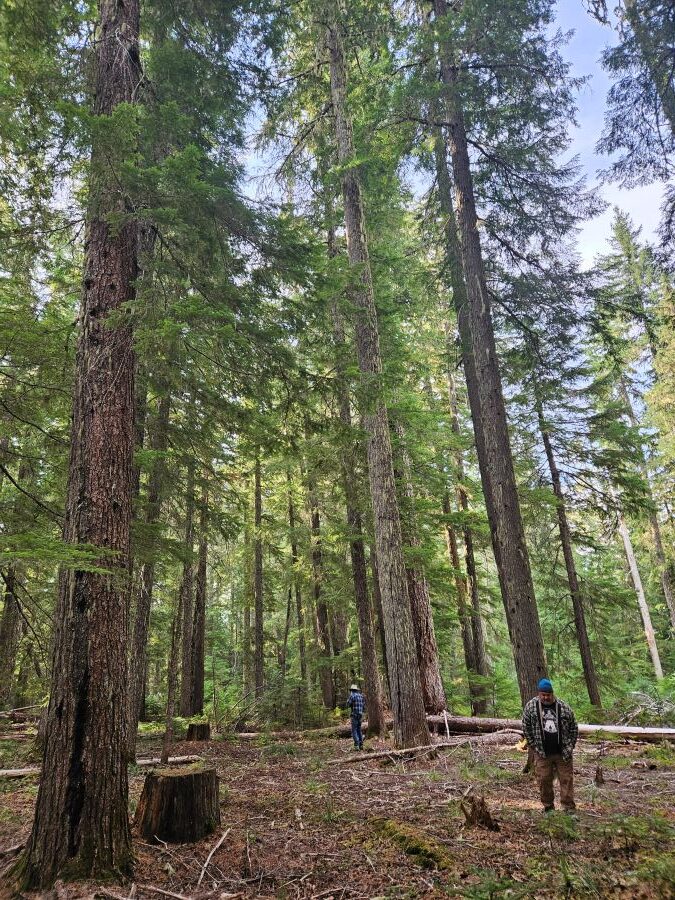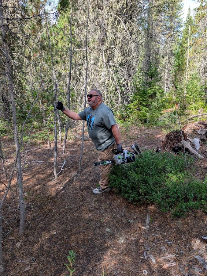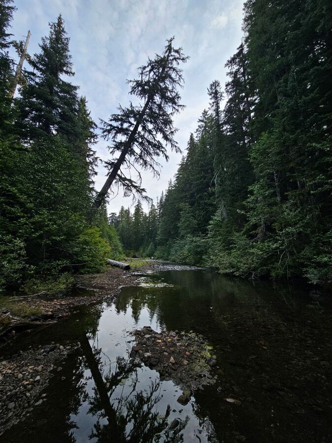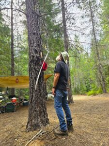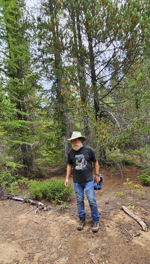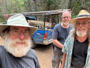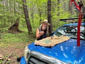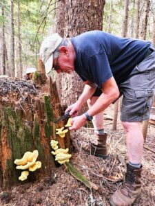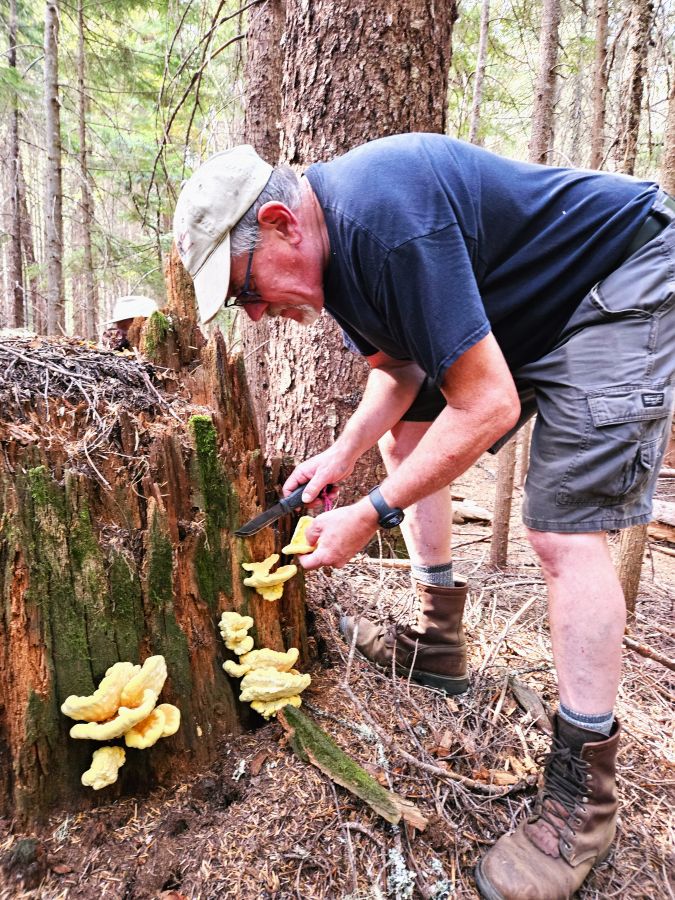Following the rutted track back to camp, we paused for some water, then continued down the spur back to the main forest service road. A short walk brought us to the trail into the old Pistol Creek camp. Andy collected some chicken of the woods from a stump along the way.