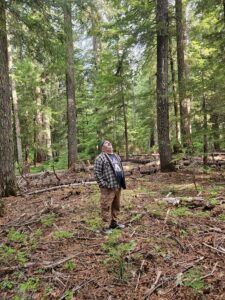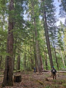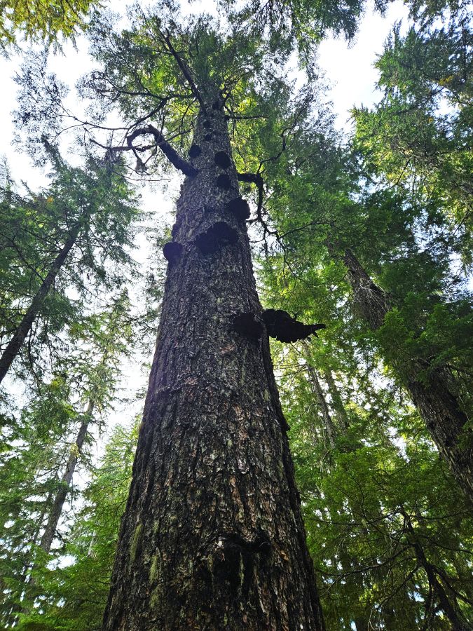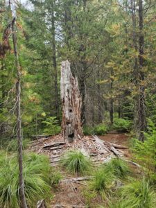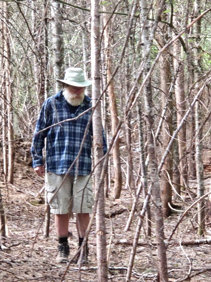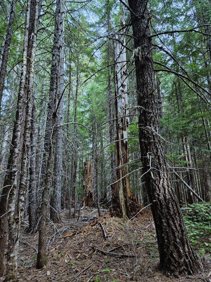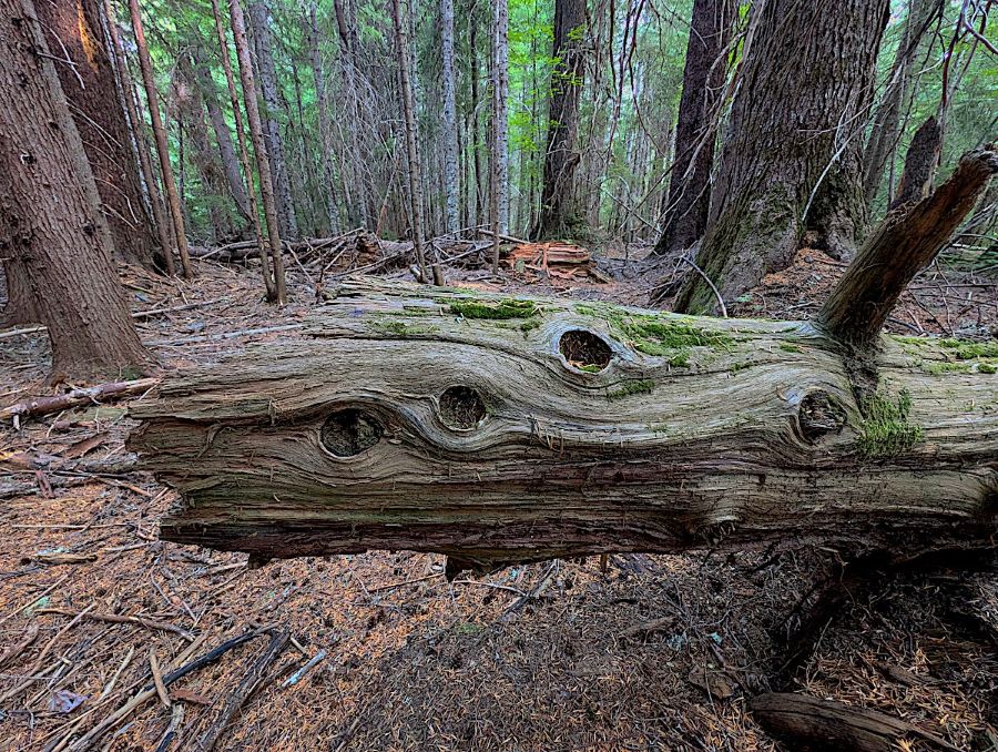 This section of woods consisted of older trees with many dead and decaying snags. Huge stumps bore witness to early logging in the area. We wandered into the forest looking for mushrooms but did not find anything edible.